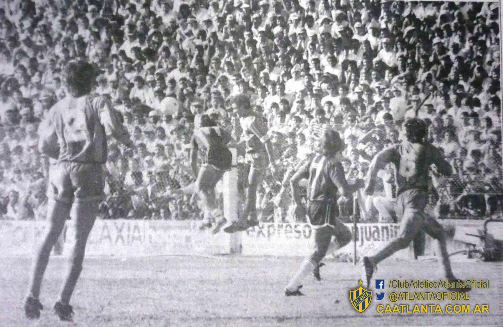 1990. Atlanta juega en San Juan frente a San Martín por el Zonal Sudeste, cuyo ganador ascendía a la B Nacional. Empataron 0 a 0. Aquí Rubén Checchia, del Bohemio, y Daniel Castro, del local, disputan una pelota en el aire. De espaldas, con el 2, el defensor auriazul Juan Silva, mientras que el 6, Fabián Ucero, marca a José González.