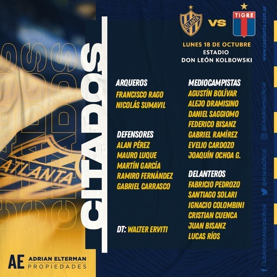 El DT Walter Erviti dió a conocer los citados que concentrarán para recibir a Tigre en casa, el lunes próximo.