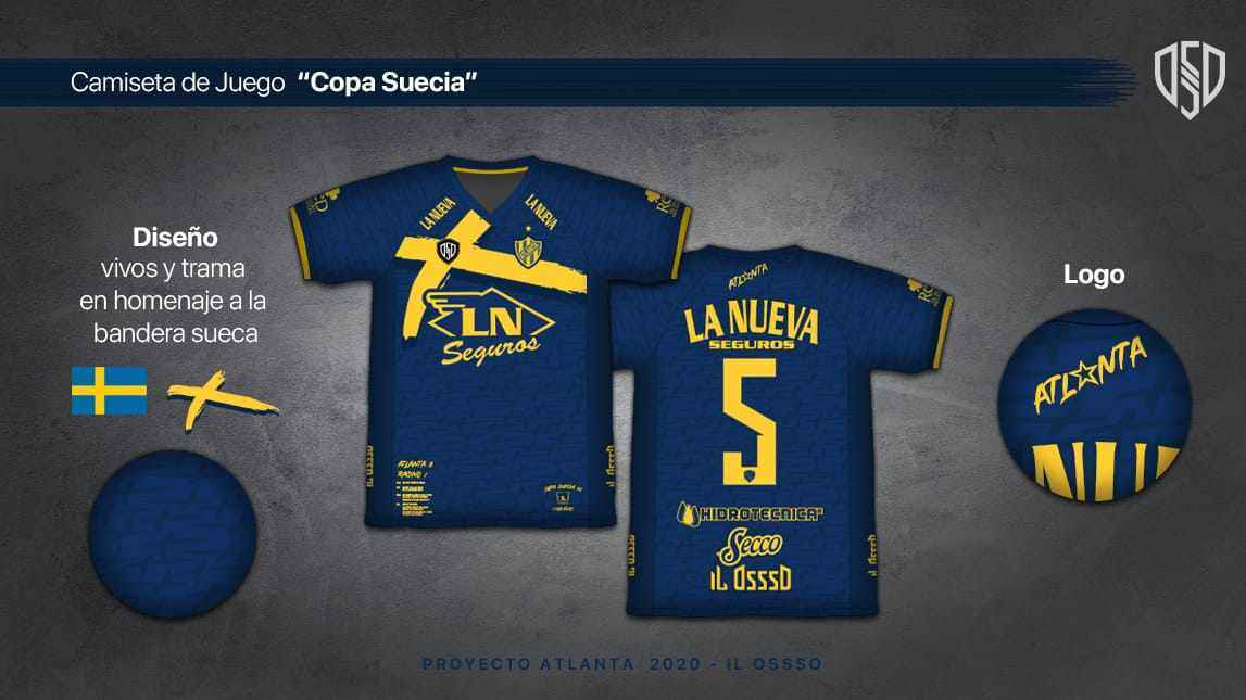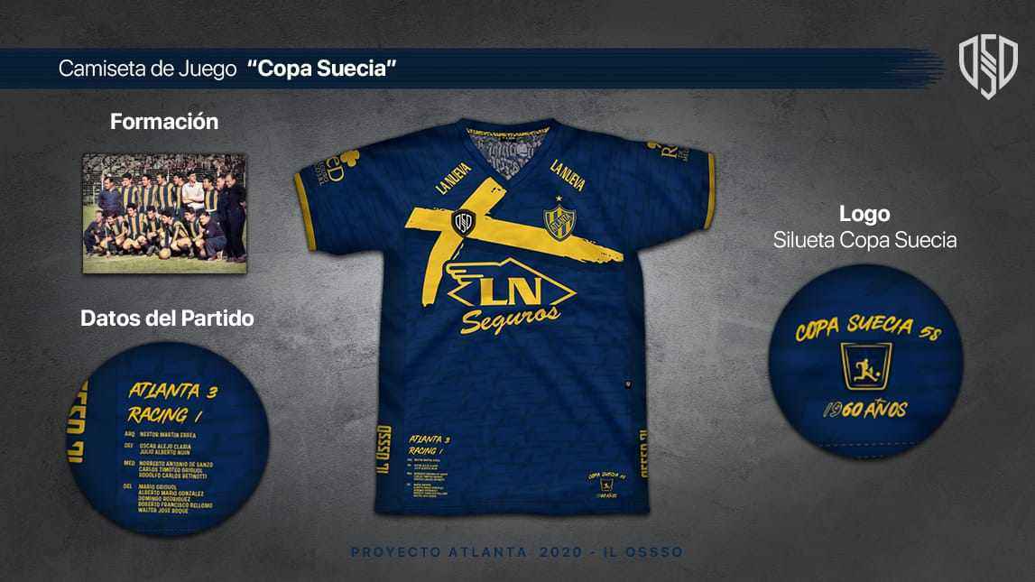 Cuenta con la formación campeona en el sector interno del cuello, el logo silueta de la Copa, los datos del partido de la final ante Racing Club y un diseño, vivos y trama en homenaje la bandera sueca.